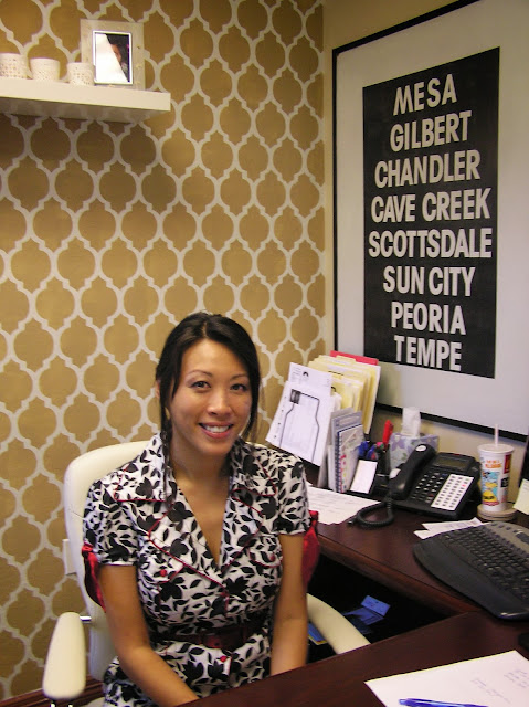 I decorated my friend Leah's office, she is a Realtor and loves bling, clean modern lines and glamour. She also said she liked how the Kardashian's home and office was decorated. After alot of surfing the net for ideas and inspiration from Pinterest and of course the Kardashian's, I had some idea of what to do in her office. We went with a neutral pallet and did an accent wall using a stencil from Cutting Edge stencils, the stencil is called Casablanca and is morrocan. I decided to call her style Modern Morrocan:) She had a huge cork board in her office that was useful but nothing much to look at, so I decided to make it into Subway art. That way it can be used for function but also has great form and makes for a great piece of art