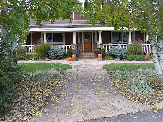 I wanted to make sure to post this while it is still Fall. How in the world is it almost time for Christmas shopping??? Easy and inexpensive touches to your front porch can quickly make it warm and inviting. Here I used Aspen stumps that I found in my Hubby's woodpile stock. Sorry Hubby! Really pretty to use them as a Pumpkin pedestal. If you elevate an ordinary item on a pedestal it instantly becomes the center of attention! I was looking for large pumpkins at Home Depot and was feeling a little irritated at the fact they cost $8 each..grrrr I will have a pumpkin patch of my own one day, I swear:) I overheard someone saying that Walmart was selling large pumpkins for $3 so I went there and found these cuties! So while on my quest for pretty but affordable Fall décor, I found these large pots of Chrysanthemums for sale at City Market for only $7..SCORE